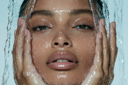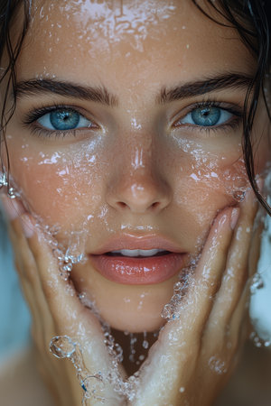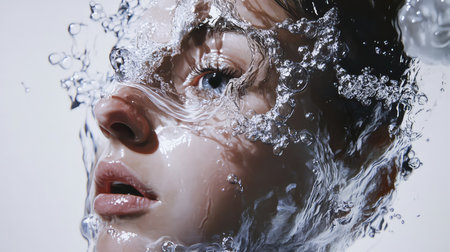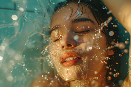 A vibrant portrait capturing shimmering droplets on damp skin, kinetic water spray, and tousled hair conveying freshness and dynamic energy.