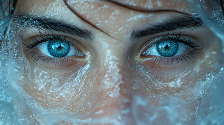 Artistic close-up of a woman's piercing blue eyes surrounded by icy textures, creating a striking and surreal visual effect.