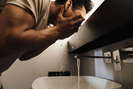 close-up photo of young afro american man washing face in shower, hygiene and bodycare, skincare concept
