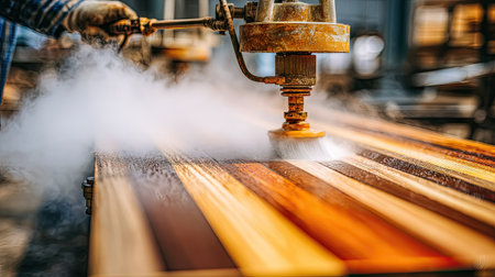 Close-up view of a machine applying steam to a large piece of multicolored wood planks. The planks are arranged in horizontal lines and are diverse in hues of brown, orange, and yellow. Steam is visibly emanating from the machine.
