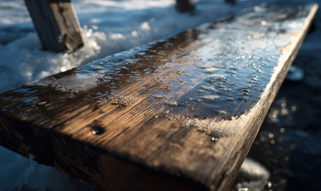 A bench with a layer of ice on it. The bench is wooden and has a few snowflakes on it