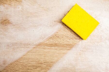 cleaning sponge wiping foam soap suds on wooden background, household washing concept