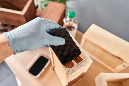 Man carpenter varnishing wooden crate for flowers with brush in her small business woodwork workshop. In your work, do you use stains or wood preservatives to show the wood pattern.