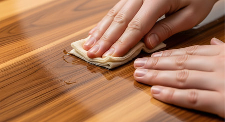 Hands gently polish a smooth wooden surface with a soft cloth, showcasing a moment of craftsmanship in a well-lit workshop filled with the scent of freshly cut wood and creativity.