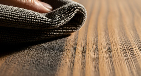 An extreme close-up showing a microfiber cloth wiping away a thick layer of dust from a wooden surface, revealing the clean wood grain underneath. This image highlights the effectiveness of cleaning and the contrast between a dirty and polished surface.