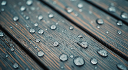 Raindrops rest on a richly textured wooden surface, each droplet reflecting soft light. The scene captures the beauty of nature's moisture, emphasizing the intricate grain and warmth of the wood after a refreshing summer shower.