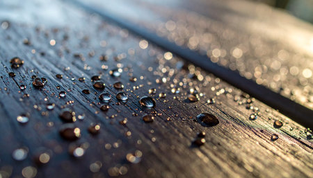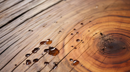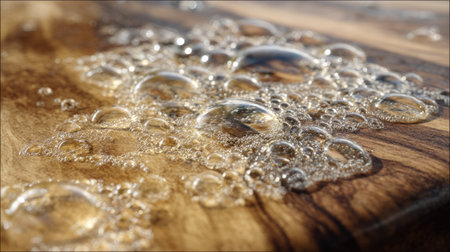 This stunning close-up captures water droplets resting on a wooden surface, showcasing intricate textures and the play of light on the liquid, evoking a sense of tranquility.