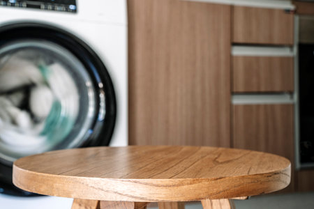 Laundry room table background. Blurred home laundry room with wooden table display for product.