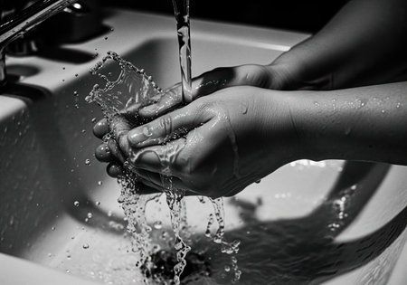 A close up, high contrast black and white image of hands washing under a stream of water, creating dynamic splashes. this evokes themes of cleanliness, freshness, and personal hygiene.