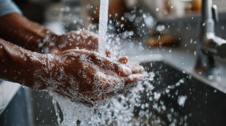 A close-up view of hands washing with soap under running water in a sink, capturing bubbles and droplets for a fresh and clean feeling. Perfect for hygiene themes.