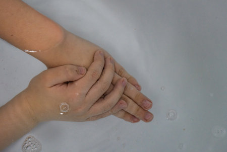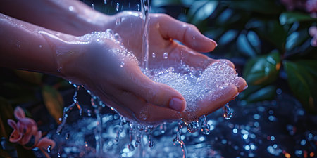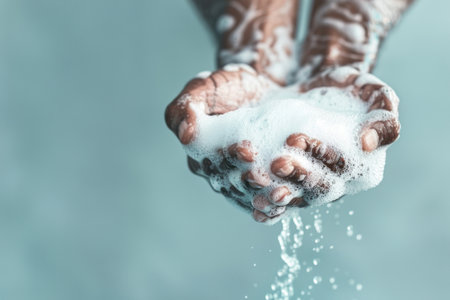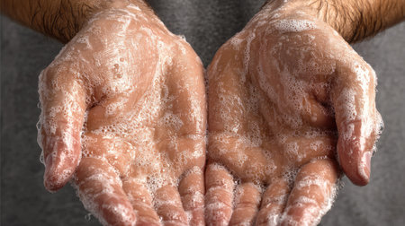 Close-up of two hands with soap bubbles, highlighting the importance of cleanliness and hygiene in daily personal care routines, emphasizing skin health.