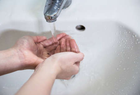 Washing hands at home in bathroom. Healthy lifestyle, hygiene and prevention viral and bacterial diseases.