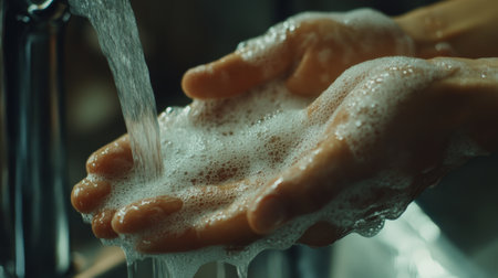 Hands lathering with soap while washing thoroughly in a dimly lit bathroom during the evening for hygiene and cleanliness