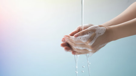 The a pair of hands being washed under a stream of running water. The hands are covered in white soap bubbles, creating a sense of cleanliness and freshness. The background is a soft pastel blue, providing a calm and serene atmosphere. The water flows smoothly, and the soap bubbles are clearly visible, emphasizing the act of washing and hygiene.
