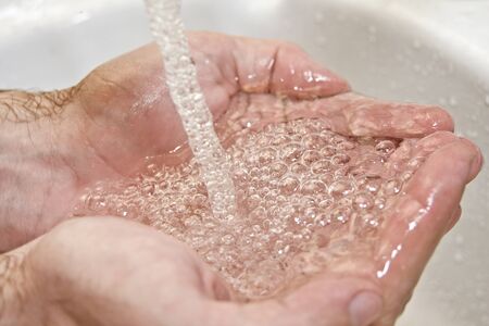 A man rinses his hands with soap suds under the flow of water from the tap over the sink. Cleanliness and hygiene.