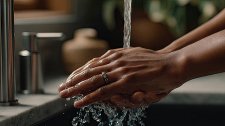 Water cascades over hands, emphasizing the importance of cleanliness and hygiene while washing in a bright, tidy environment.