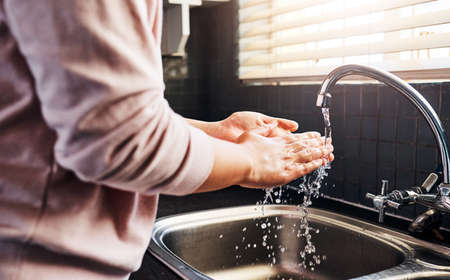 -..Keep your hands clean at all times. an unrecognizable woman washing her hand in the kitchen sink.