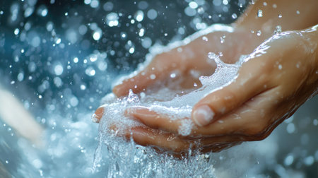 Close-up image shows hands cupping clear water, with droplets and splashing effects. The texture is detailed, with a focus on liquid movement and interaction. The lighting appears soft, indicating an indoor or shaded environment. Suitable for conceptual illustrations related to resources and hygiene.