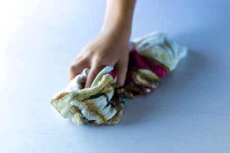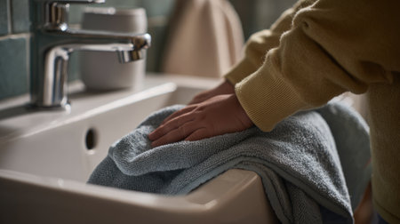 A close-up view of a person using a soft towel to clean a bathroom sink, showcasing hygiene and daily maintenance in a modern and inviting space.