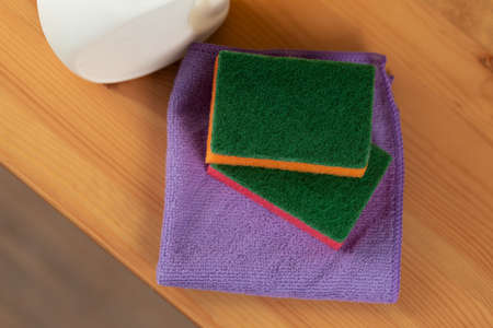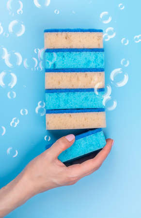 Action The hand holds a blue sponge on a colored background. The concept of washing dishes and cleaning