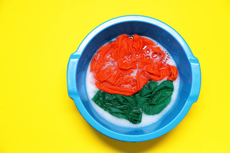 Color clothes soak in powder detergent water dissolution. Laundry concept