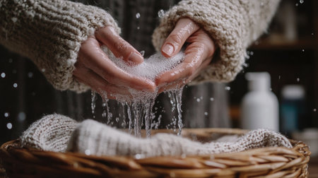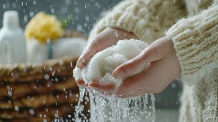 Gentle hands wash delicate fabric in bubbles, evoking a cozy atmosphere with soft textures and calming water flow, emphasizing cleanliness and care in daily routines.