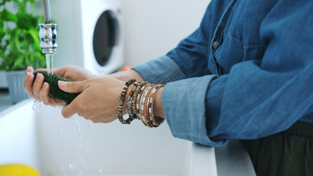Close up details of woman washing hands at home . Hygiene and body cleaning concept detail