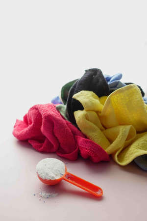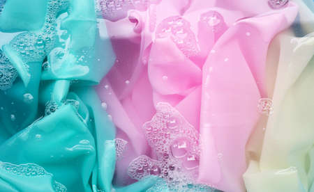 Color clothes soak in powder detergent water dissolution. Laundry concept