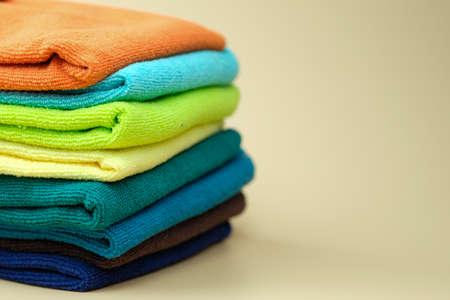 Multicolored folded microfiber rags on a blue background. Cleaning equipment concept