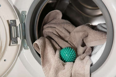 Green dryer ball and towels in washing machine drum, closeup