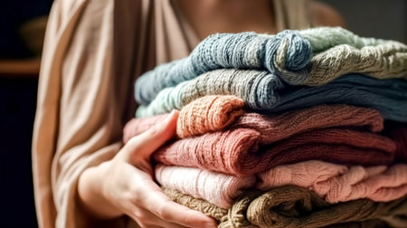 hands woman hold A pile of clothes next to a washing machine. Generative Ai.