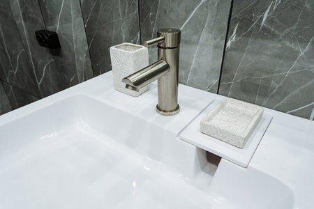 Luxury faucet mixer on a white sink in a beautiful gray bathroom