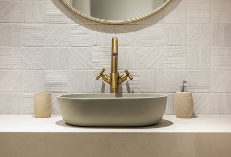A modern bathroom sink featuring a sleek faucet, designed for elegance and functionality. Ideal for interior design inspirations and cleanliness themes.