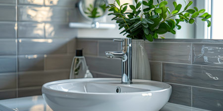 Discover a modern bathroom scene featuring a stylish sink and faucet, complemented by elegant decor and greenery, promoting relaxation and fresh aesthetics.