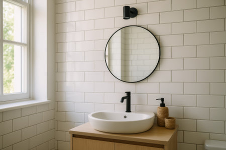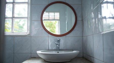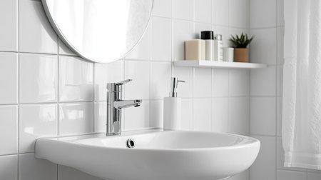 A beautiful bathroom scene featuring a modern white sink and round mirror, complemented by bright white tiles. This space radiates cleanliness and tranquility.
