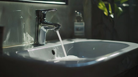 A stunning close-up view of a sleek modern bathroom faucet flowing water, showcasing contemporary design and tranquil atmosphere ideal for home decor.