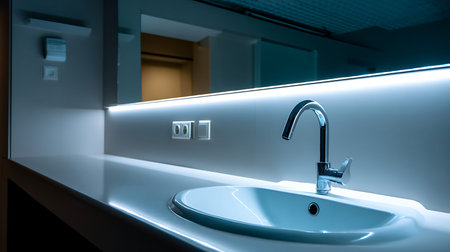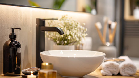 A sleek bathroom scene showcasing a modern sink and faucet, combining minimalist design with a cozy atmosphere, perfect for stylish domestic interiors.