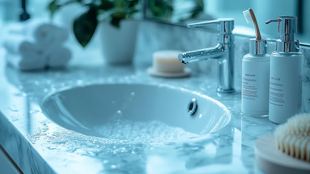 Clean Hands, Healthy Lives, Exploring the Hand Washing Ritual with a Soap Dispenser on a Bathroom Washstand. Generative AI