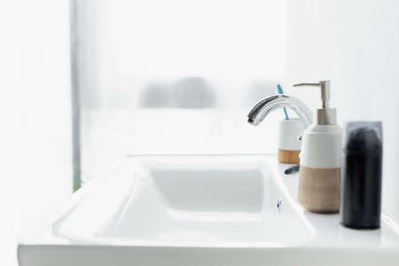 Oral care and dental hygiene concept. Electric toothbrush in cup and soap dispenser bottle near basin. Element of white modern bathroom with chrome water tap over sink at blurred copy space background