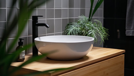 AI Generated. Modern bathroom design featuring a sleek wash basin and a touch of greenery