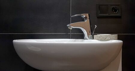 Bathroom interior with sink and faucet. Modern apartment in the attic of the house. White ceramic washbasin with chrome tap on a black tile wall.