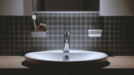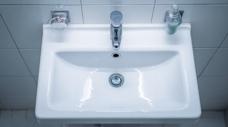 White ceramic sink with chrome faucet and soap dish on tiled wall background. Perfect for hygiene, cleaning, and interior concepts.