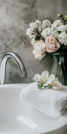 Discover a minimalist bathroom design featuring a sleek luxury faucet paired with a stylish white sink, complemented by elegant floral arrangements and soft lighting.