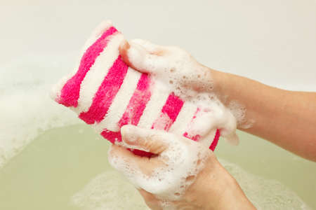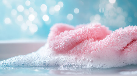 A soft pink towel rests on a layer of foam with a serene blue background. This image conveys relaxation, comfort, and cleanliness, perfect for spa or bath-related themes.
