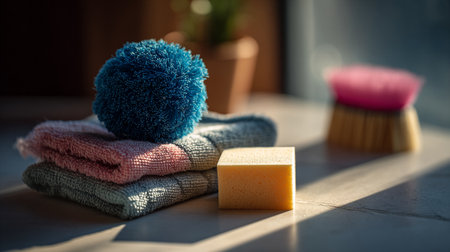 Cleaning tools and supplies illuminated by sunlight showing preparedness for household chores