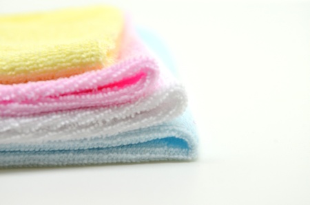 Clean towels gray, orange, lilac, white on a pink background. Place for text.