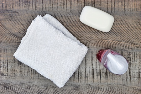 Soap, shower towel, bath mitten on gray, plaster flat lay background with copy space. Hygiene concept.