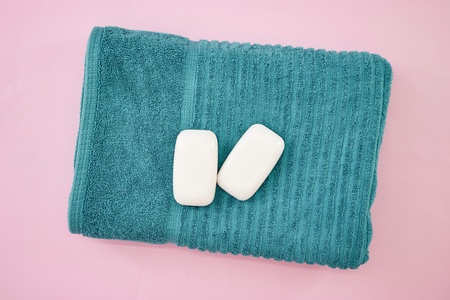 Soft and fluffy towels on a blue background. Soap for bath, laundry and body care. Personal hygiene products. Bath amenities, spa