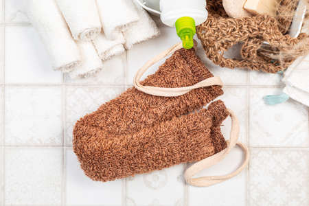 bath sponges for the body, soap and towels on a light background. eco-friendly natural bathroom accessories