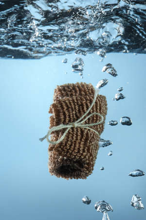 A natural yellow sponge on towels stacked on a white wooden table. Personal care and hygiene. Bath and relax